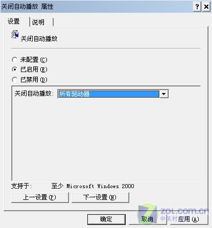 在“开始”→“运行”里键入“gpedit.msc”,便打开“组策略”窗体,在“计算机配置”→“管理模板”→“系统”栏里,双击“关闭自动播放”项,把它设成“已启用→所有驱动器”。禁用“自动播放”功能。
