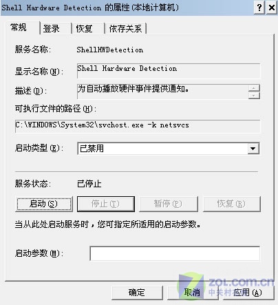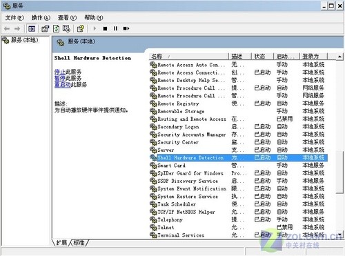 先点击“开始”→“控制面板”→“管理工具”项打开“服务”窗体,找出且双击“Shell Hardware Detection”服务,把它设成“禁用”,能关闭“自动播放服务”。