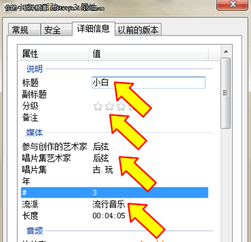 如图所示,在mp3音乐文件上,点击右键-属性-详细信息标签,便能够更改了。