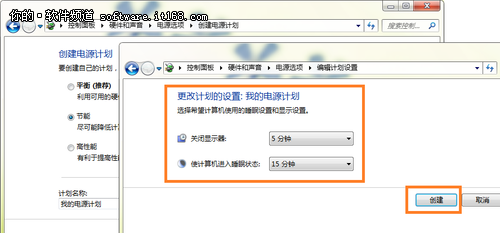 Windows7系统预设的电源计划或许不能满足您的个性化需求,此时能够自个动手,创建一个电源计划。电源选项里默认的设置当然是中规中矩的,若希望达到最节能,那仅能自个自定义一个方案。单击“电源选项”窗体左边导航栏上的“创建电源计划”,进至“创建电源计划”窗休,选取一类最贴近真实需求的计划,填写计划名称(像:我的电源计划),然后单击“下一步”,在新窗体内设置好关闭显示器与令电脑进入睡眠状态的时间,最后单击“创建”按钮(如图3所示),便能创建一个电源计划。