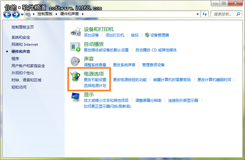 先单击“开始→控制面板”,便打开“控制面板”,然后单击“硬件和声音”,进至“硬件和声音”窗口,单击“电源选项”(如图1所示),便打开Windows7系统“电源选项”。