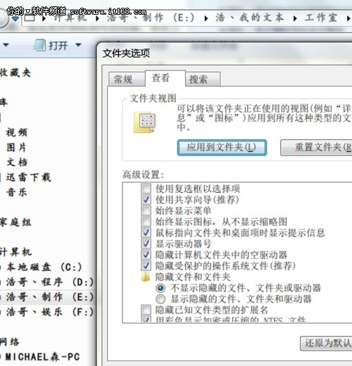 办法一: 依次打开资源管理器—组织—文件夹选项—查看—显示所有文件,在显示的全部文件里找出图标损坏分区里边的autorun.inf文件,将其删除,随后重新启动计算机便OK了。