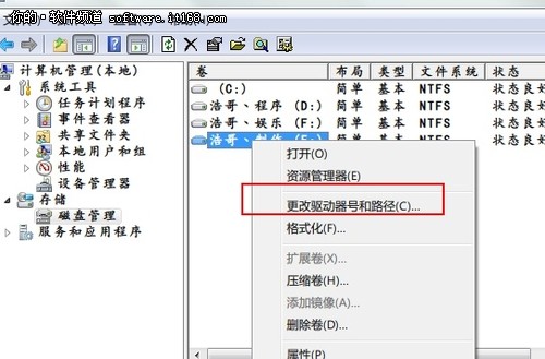 办法二:先打开“计算机”的属性,在导航栏里选取“ 管理—磁盘管理”,找出图标显示有错误的磁盘用鼠标右击,此时选取“更改驱动器符号和路径”,先随便的修改为其他的,随后肯定得更改回来,此时您再看下,图标已回来了。