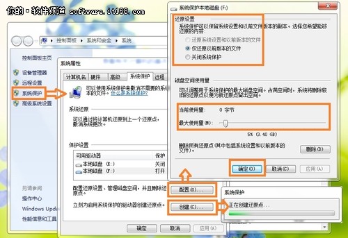若想在误删除文件后迅速找回,先要打开Windows7“系统保护”功能,把鼠标指针移动至桌面“计算机”图标上,再单击鼠标右键,在跳出的快捷菜单里选取“属性”,便打开“系统”窗体,单击窗体左边导航栏上的“系统保护”,跳出“系统属性”窗体,选取一个需要保护的磁盘分区,再单击“配置”,在跳出的新窗体内选取“仅还原以前版本的文件”,且设置好磁盘空间使用量,随后单击“确定”按钮返回“系统属性”窗体,再单击“创建”按钮,跳出“创建还原点”小窗体,键入还原点描述,然后单击“创建”,Windows7打开“系统保护”功能,且创建还原点(如图1所示)。