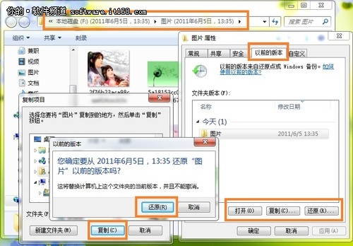 打开Windows7“系统保护”功能,创建还原点之后,若在使用计算机过程里误删了文件,能够非常方便地找回。把鼠标指针移动至误删除文件的文件夹上,再单击鼠标右键,在跳出的快捷菜单里选取“属性”,跳出“属性”窗体,切换至“以前的版本”选项卡,便能够看见误删除文件之前的文件夹,先选中文件夹,再单击“打开”按钮,能够打开文件夹找到误删除的文件,然后单击“复制”按钮,能够把文件夹拷贝至本地磁盘的任何位置,最后单击“还原”按钮,便能够还原文件夹,找回误删的文件(如图2所示)。