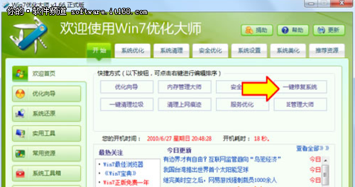 此方法需要Win7优化大师。先打开Win7优化大师,点击快捷方式里的“一键修复系统”,若有提示便重新启动一下Windows7应当便能够解决了。如下图所示: