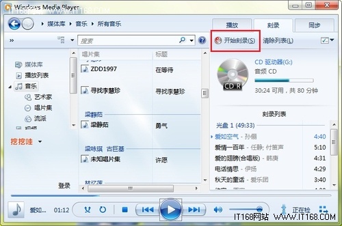 若选取“生成一张音乐CD”,再单击“下一步”,系统便直接开始刻录;若选取“生成一张数据CD”,再单击“下一步”,系统便会调用Windows Media Player,这时咱们只要单击“开始刻录”按钮,Windows7便自动完成刻录工作(如图5所示)。