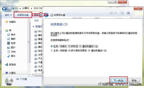 除了刻录数据光盘之外,Windows7自带的刻录功能还能够方便地刻录音频CD光盘,把需要刻录的音乐文件拷贝、剪切或者拖动进来之后,再单击“刻录到光盘”按钮,启动“刻录到光盘”向导,设置好光盘标题与刻录速度,然后单击“下一步”,进至“刻录音频CD”窗体,选取一类刻录模式(如图4所示)。