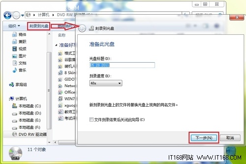 刚刚说的刻录“类似于USB闪存驱动器”光盘,若选取“带有CD/DVD播放器”,再单击“下一步”,系统便不会对空白光盘进行格式化,而是直接打开,把需要刻录至光盘的文件拷贝、剪切或者拖动进来之后,再单击“刻录到光盘”按钮,启动“刻录到光盘”向导,进至“准备此光盘”窗体,设置好光盘标题与刻录速度(如图3所示),接着单击“下一步”按钮,Windows7便自动完成光盘的刻录。