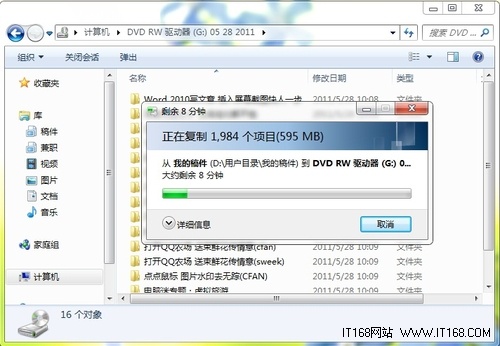 对空白光盘格式化完毕之后,会自动打开空白光盘,把需要刻录至光盘的文件拷贝、剪切或者拖动至空白光盘窗体内,刻录机开始工作,把有关文件刻录至光盘里(如图2所示),整个刻录过程完全自动化,不用人工干预,犹如平日里拷贝与移动文件那么简单。