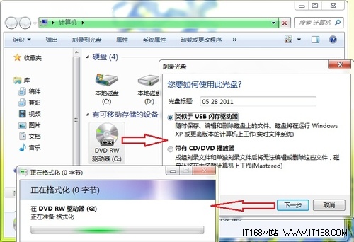 将一张空白光盘放进刻录机,再打开“计算机”窗体,然后双击刻录机图标,跳出“刻录光盘”对话框,选取刻录类型。此处有2个选项:一个为“类似于USB闪存驱动器”;另一个为“带有CD/DVD播放器”。选取“类似于USB闪存驱动器”,刻录一张能够随时保存、编辑与删除文件,能够在WinXP或者更高版本系统里运行的光盘;选取“带有CD/DVD播放器”模式刻录光盘,光盘能够在大部分电脑上工作,可是光盘里的文件不能编辑或者删除。若选取“类似于USB闪存驱动器”,再单击“下一步”,系统便会对空白光盘进行格式化(如图1所示)。