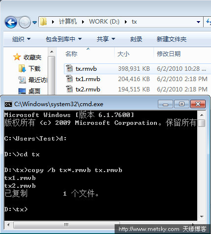 如此便能够将上边文件组件合并成一个,实际使用tx*.rmvb得覆盖更换为你保存的文件名与后缀名,如下图所示: