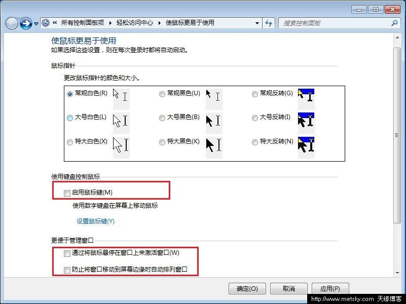 位置:控制面板——轻松访问中心——使鼠标更易于使用。事实上笔者觉得都是些”捣乱“的功能:)。