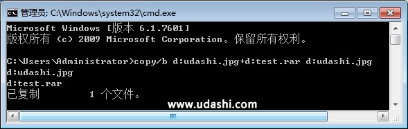 第四.咱们假定将两个文件均存放在 D盘根目录下。键入命令:copy /b D:udashi.jpg + D:test.rar D:udashi.jpg(意思为拷贝壳udashi.jpg与test.rar,而后生成udashi.jpg)。
