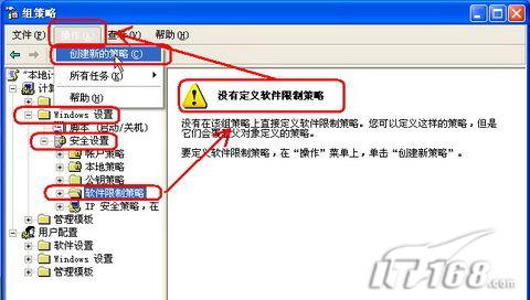 2)、在“组策略”对话框的左边窗格里顺次双击“计算机配置”→Windows设置→安全设置→软件限制策略,此时若右边窗格里显示“没有定义软件限制策略”的提示,那么单击菜单栏“操作”→创建新的策略,如图1所示。
