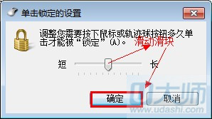 第三:跳出“单击锁定设置”对话框后再在对话框里移动滑块,设置合适之时间长度,完毕之后点击“确定”(提示:若在平时的单击操作里出现锁定,便应当适当增长锁定时间)。