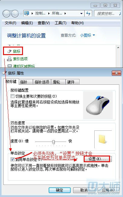 第二:打开“控制面板”之后,找出“鼠标”选项且单击跳出“鼠标属性”窗体,勾选下边的“启用单击锁定(T)”,随后单击旁边的“设置”按钮。