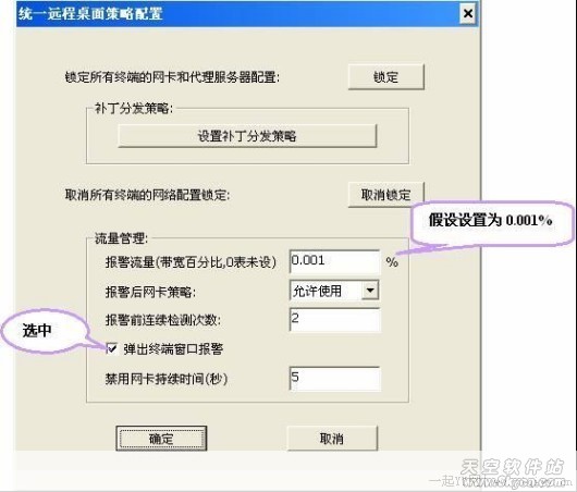 其中报警流量是占带宽之百分比。若“报警后网卡的策略”选中“禁止使用”表示在流量报警后,网卡会自动禁用,禁用的时间通过“禁用网卡持续的时间”来控制。若选中”允许使用“表示在流量报警后,网卡是不会被禁用的。同时若选择“弹出终端窗口报警”,当客户端超过设定的流量,客户端会跳出警告的窗体。