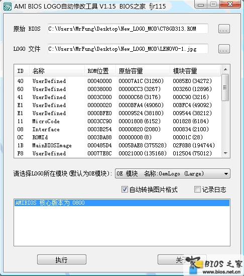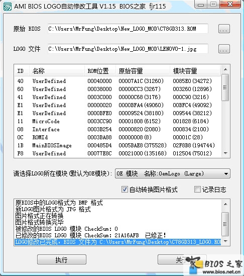 第三、再点击执行,软件便会自动将LOGO替换进BIOS文件,且生成替换了LOGO的新BIOS文件(如图2所示)