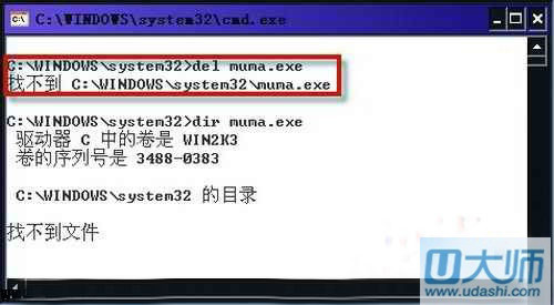 详细做法:咱们假定病毒文件在C:WINDOWSsystem32目录,文件名是muma.exe。咱们依次点击“开始”菜单→“运行”,敲入“cmd”运行“命令提示符”,敲入命令“del muma.exe”,通常情形下,病毒文件会被删除。可若提示找不到文件,表示病毒文件的作者留了一手,给病毒文件添加上了防删除的只读与系统属性。要处理此问题很简单,咱们能够敲入命令“attrib -s -r muma.exe”,按Enter键之后便能把它的属性去掉,随后再使用“del muma.exe”命令把病毒文件删除。