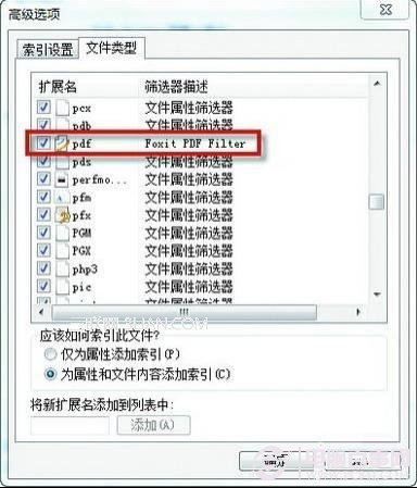 先单击“高级”按钮,打开“高级选项”对话框的“文件类型”选项卡;然后分别勾中“PDF”复选框与下面的“为属性和文件内容添加索引”单选框;最后单击“确定”按钮,系统便能够开始对F盘执行索引的建立操作了。