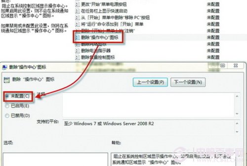 第二:进至“删除操作中心图标”设置之后,把设置更改成“未配置”,点击确定后保存退出。