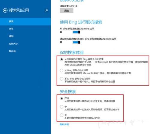 在这个页面中,还可以看到有【你的搜索体验】还有【安全搜索】的设置。可以通过设置是否是用自己的特定位置,是否获取个性化设置,还可以在安全搜索中为家里小朋友,筑起一道防火墙。