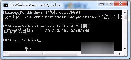 然后在DOS窗口中输入字符串“systeminfo find "日期"”,回车,等待片刻,就可以看到当前Win7系统的安装日期和时间信息如下图4所示。如果直接输入“systeminfo”命令,回车后还可以看到更多当前Win7系统信息,比如系统名称、系统版本、制造商、配置、安全信息、产品ID、处理器、已经安装的更新等等。非常方便。大家不妨一试。