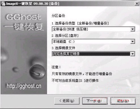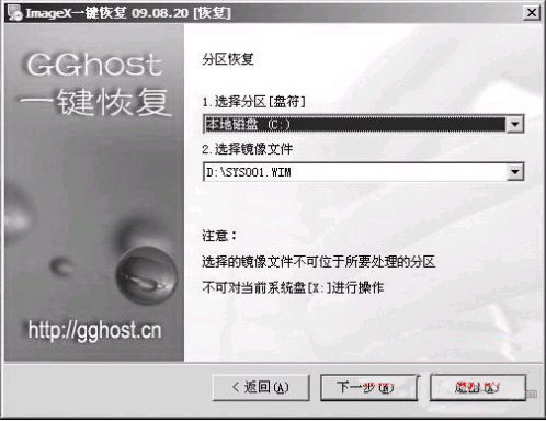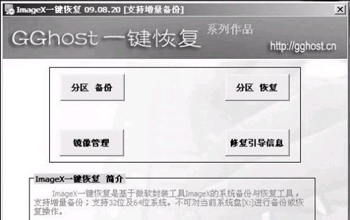 不过利用原始的ImageX程序要在DOS环境中运行,而且要输入一些DOS命令,这对于普通用户来说也太“高深”了一些。不要紧,我们可以借助另外一款软件——“ImageX一键恢复”(又叫“GGhost一键恢复”),它已经集成了ImageX。通过它,整个操作过程都可以在图形界面完成,用户只需根据需要点点鼠标就可以了。