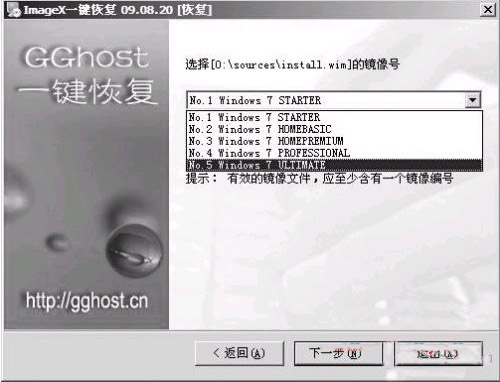 恢复分区默认是“本地磁盘 (C:)”,一般不用更改,选择镜像文件,定位到Win7安装盘(笔者使用的是Win7五合一安装盘,光驱盘符为“O”)当中的文件“O:\sources\install.wim”(如果系统中有安装程序的ISO镜像文件,建议用虚拟光驱软件加载,这样操作速度更快),点击镜像文件右侧的下拉列表,可以看到有5个镜像文件,即5个Win7版本,选择第5项——“No.5 Windows 7 ULTIMATE”,即Win7旗舰版(如图2所示)。