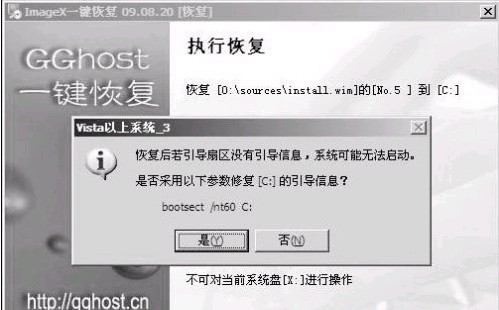 复制完成后会出现一个提示窗口,提示:“恢复后若引导扇区没有引导信息,系统可能无法启动。是否采用以下参数修复[C:]的引导信息?”,此时一定要点击“是”修复(如图3所示)。